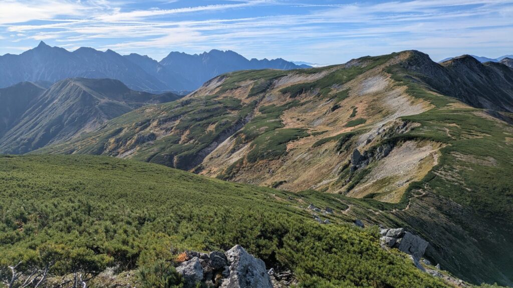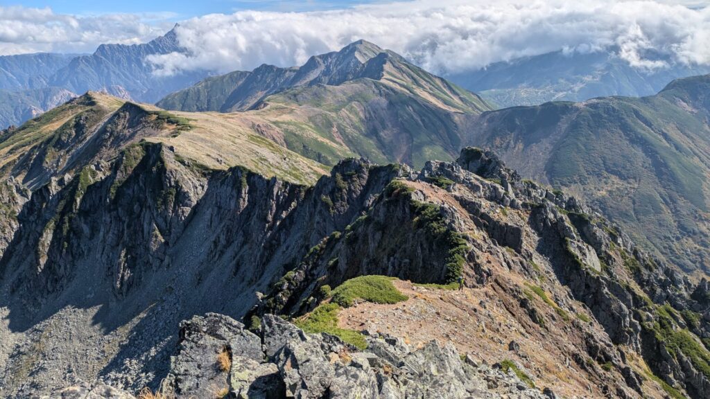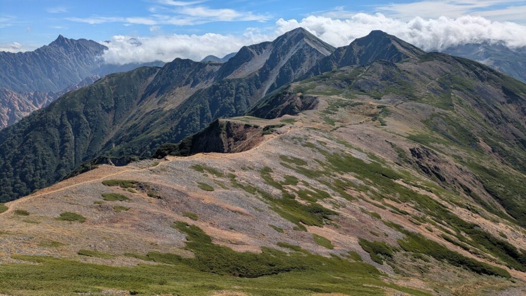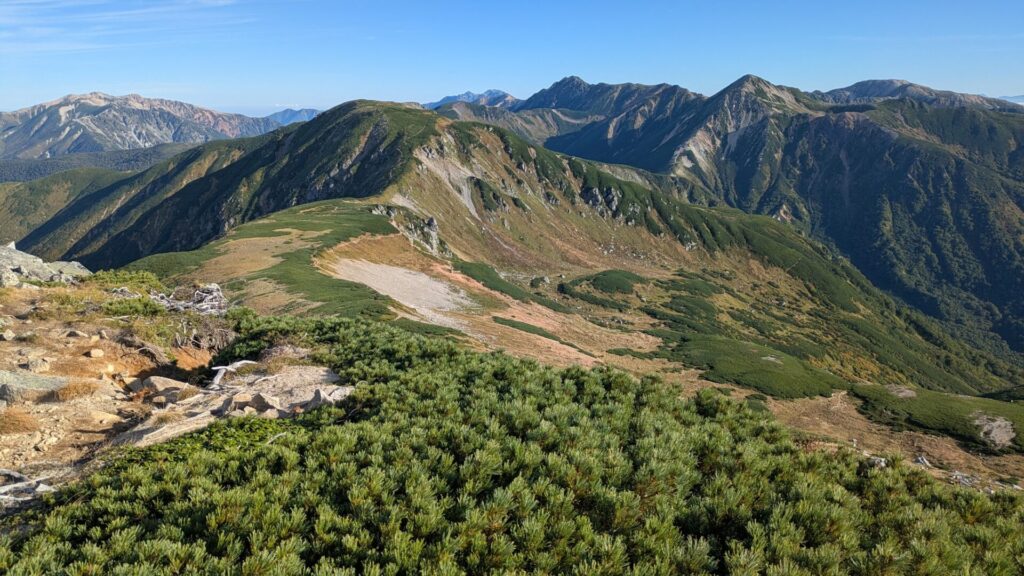 最終日以外は天気にも恵まれて表銀座をみながらの稜線歩きはエモい感じでした。慣れない3000mの縦走はもうろうとなってきます。上記の写真は三俣蓮華岳らへん。三俣とは頂上が岐阜県、富山県、長野県をまたいでいるからだそうです。左上に槍ヶ岳がみえます。わたしのはじめての北アルプスは槍ヶ岳でした。