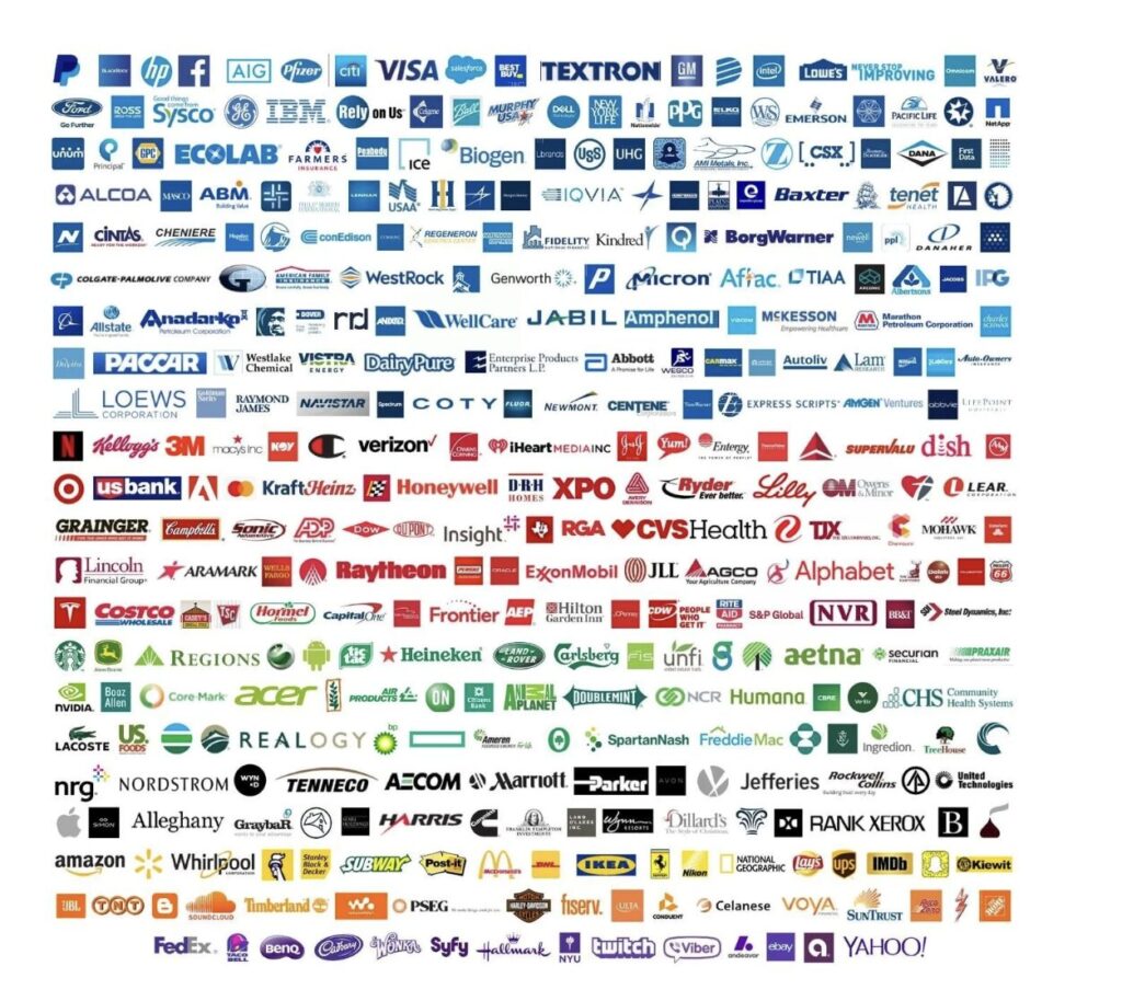それは何故かというと、青は安全や安心を表現する色だからです。金融や保険業界にとっては人気の配色です。その一方、赤は挑戦を表現する大胆な選択です。赤いロゴマークは、食品や小売ブランドが使うことが最も多いと、下記で記載されているフォーチュン500のロゴ表で確認できます。